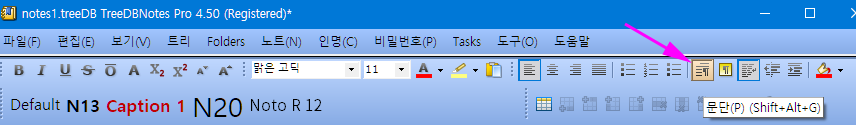 메뉴 -> 노트 -> 문단 형식 -> 문단 (Shift + Alt + G)