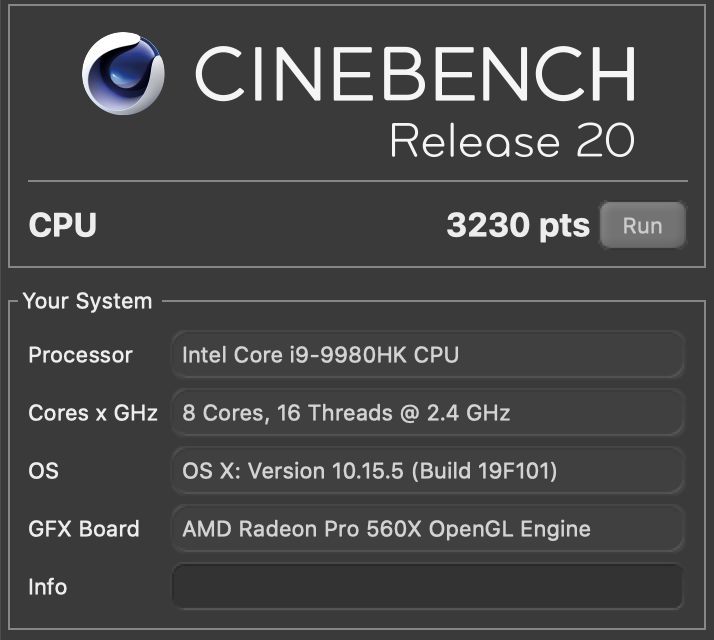 CPU : i9-9980HK , 2.4 GHz( ~ 5.0 GHz)