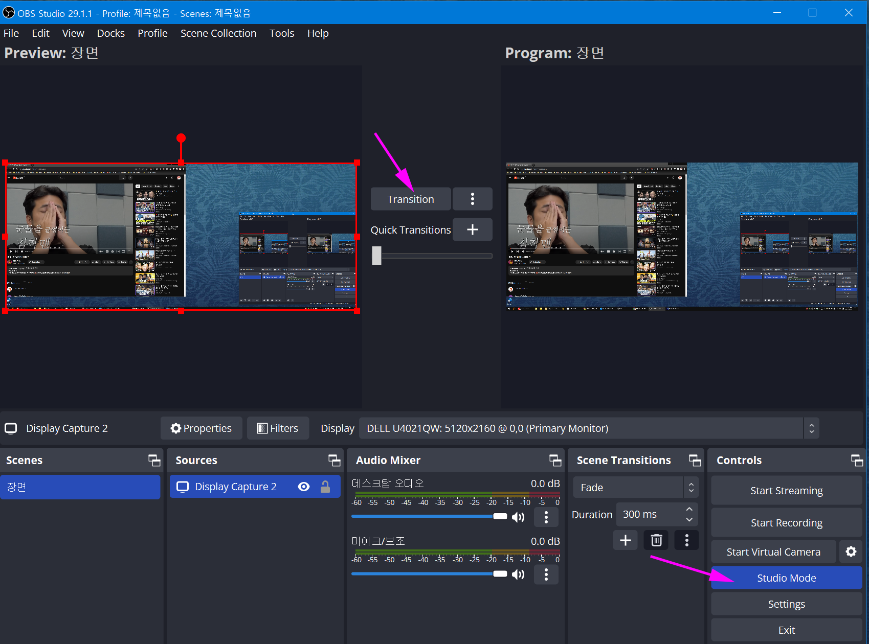 Studio Mode를 끄거나, Transition 선택