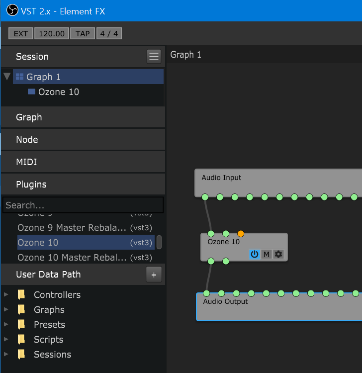 Element 화면에서 PlugIn 항목에서 VST3 플러그인 선택해서 드래그 -> Audio In 과 VST 연결 , VST와 Audio Out 연결