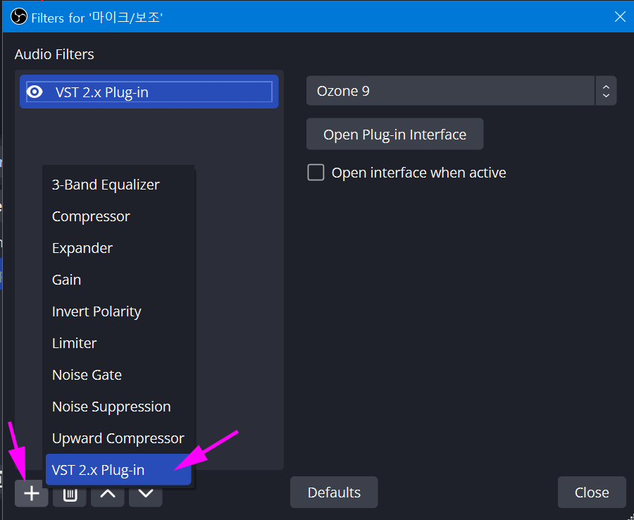 - OBS Studio v29 (2023-03) 은 VST2만 지원(VST3 사용 불가)