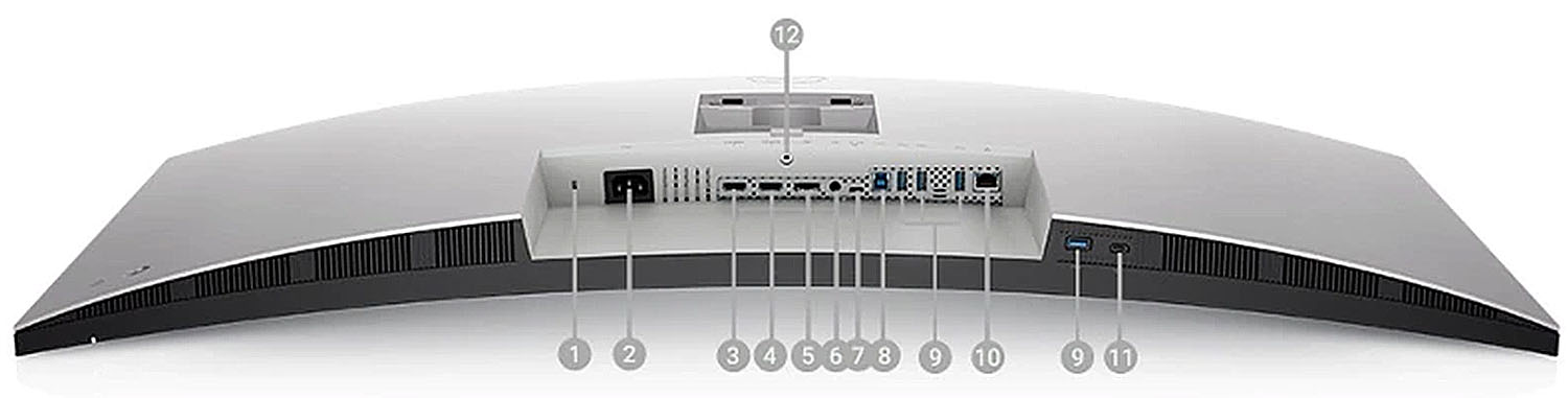 1. 보안 잠금 슬롯 | 2. 전원 커넥터 | 3. HDMI 포트 | 4. HDMI 포트 | 5. DisplayPort(입력) | 6. 오디오 라인 출력 포트i | 7. Thunderbolt™ 3(90W)/DisplayPort | 8. USB 업스트림 포트 | 9. 초고속 USB 10Gbps(4개의 USB 3.2 Gen 2) | 10. RJ45 | 11. USB-C 다운스트림 포트 | 12. 스탠드 잠금 장치