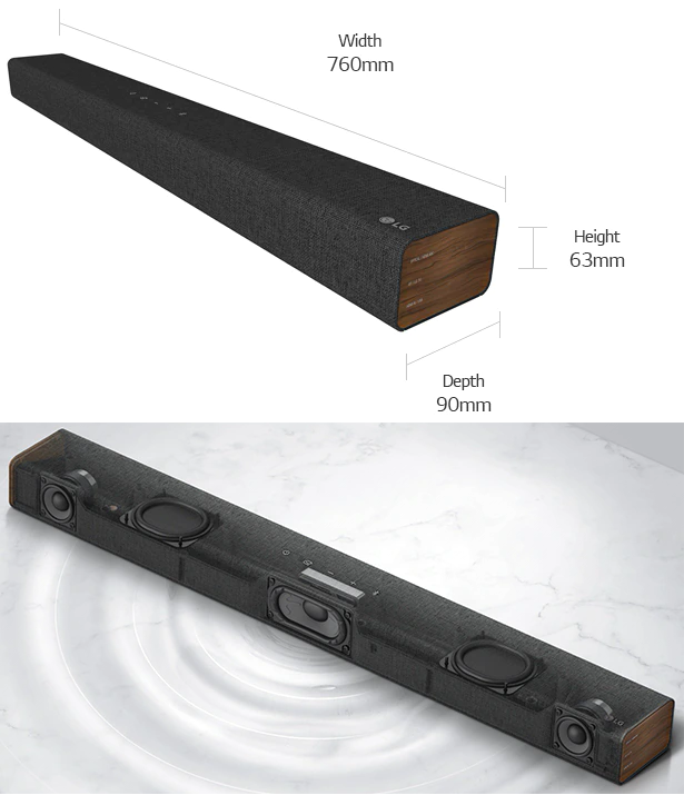 사운드바 / 3.0채널 / WiFi연결 / 블루투스 / SBC / AAC / USB / HDMI / HDMI CEC / DTS Virtual:X / 돌비디지털 / One Control / 탭사운드 / 볼륨조절 / 곡면형 / 벽걸이가능 / 2.7kg / 가로:76.4cm