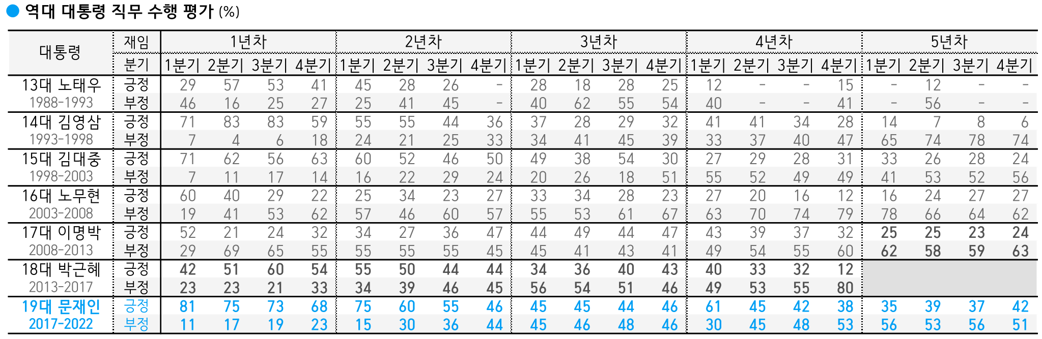 역대 대통령 직무 수행 평가 (%)