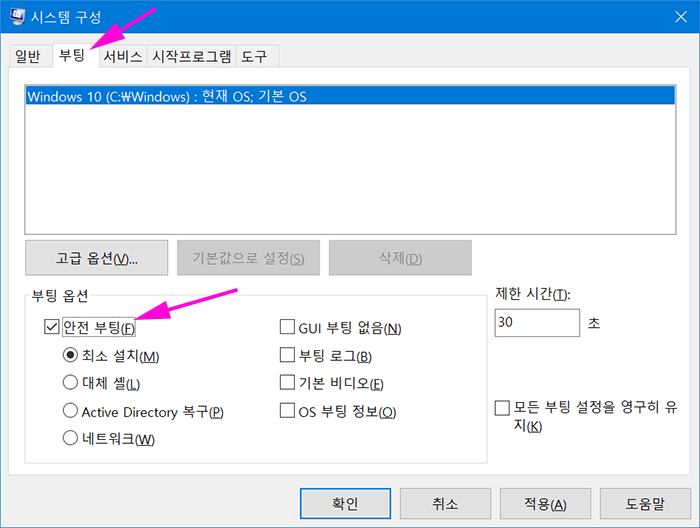 msconfig 명령 실행 -> 부팅 -> 안전 부팅 : 체크