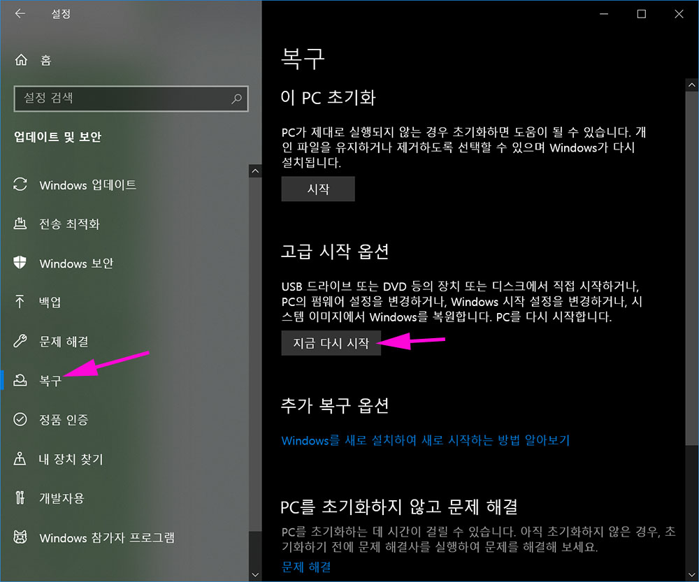 윈도우 설정 -> 업데이트 및 보안 -> 복구 -> 고급 시작 옵션 : "지금 다시 시작" 버튼 클릭