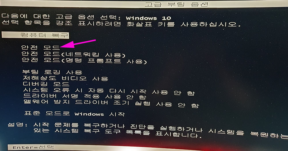 - 부팅시 바이오스 화면부터 F8키 연타 -> 고급 부팅 옵션 : "안전 모드" 선택