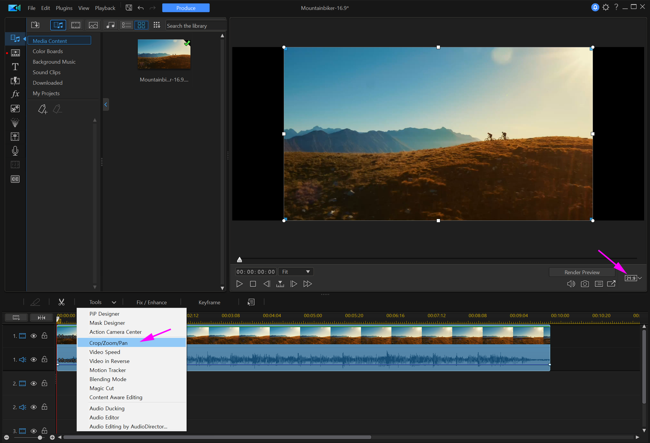* '영상 트랙 바'위의 Tools 메뉴 -> Crop/Zoom/Pan