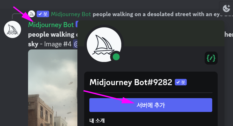 생성된 그림들 시작 부분에 있는 'Midjourney Bot'을 클릭 -> '서버에 추가(Add to Server)' 선택