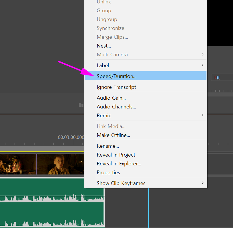 오디오 트랙에서 마우스 우클릭 -> Speed/Duration 선택