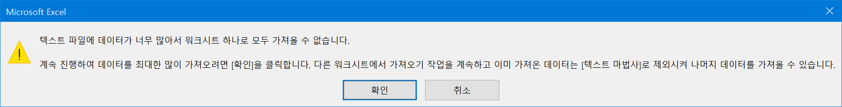 "텍스트 파일에 데이터가 너무 많아서 워크시드 하나로 모두 가져올 수 없습니다."
